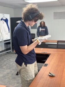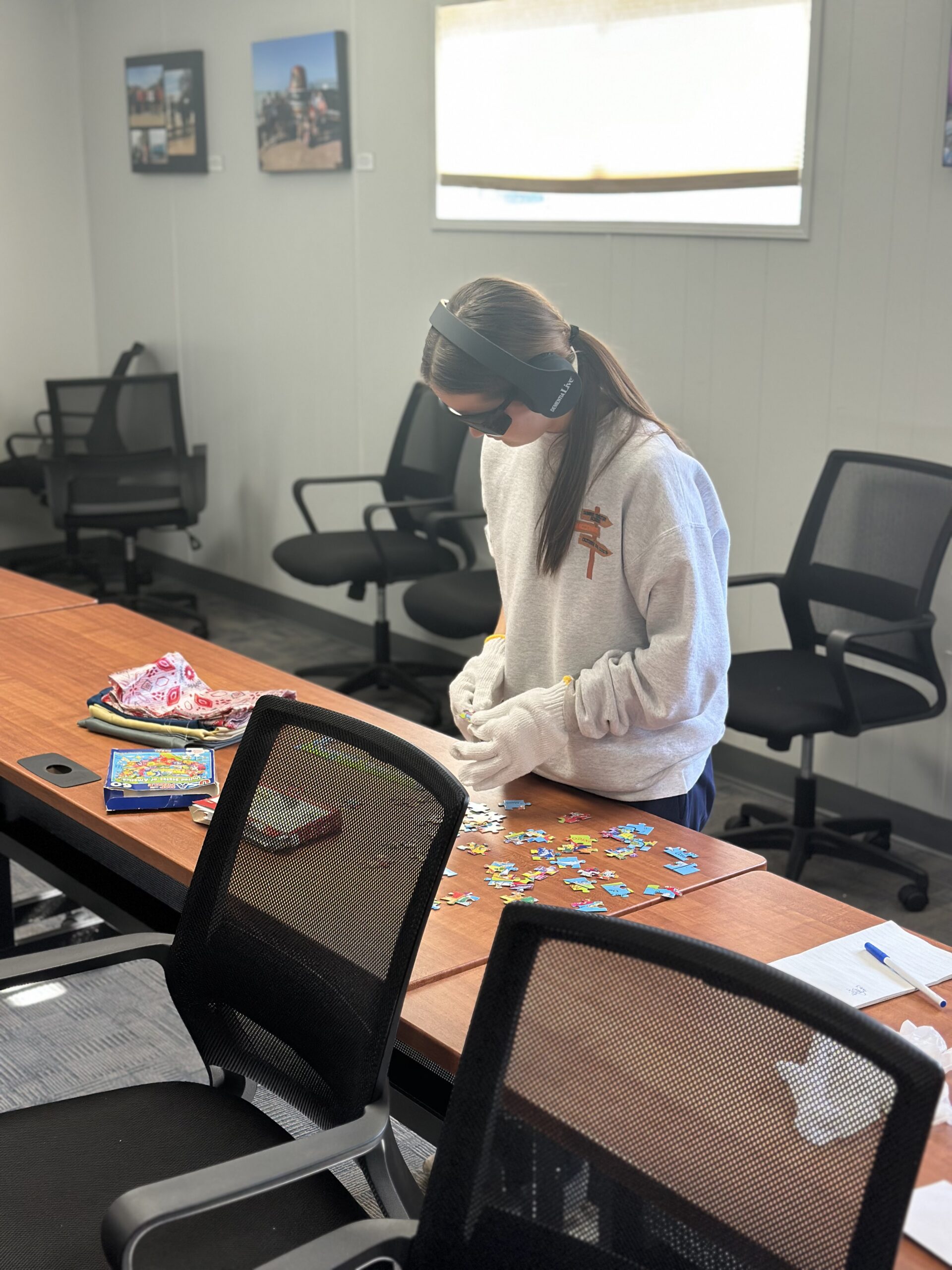 During training, students also participated in an experience designed to mirror some of the daily challenges faced by individuals living with dementia. While wearing tunnel vision glasses, two layers of gloves, and headphones playing distracting sounds, students were asked to complete simple tasks. Many students shared that the experience gave them more compassion for people living with dementia. They are excited to take the skills they’ve learned into the real world when they volunteer at a local memory care center in the coming weeks.
